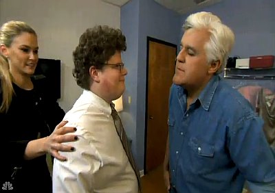 The 'Tonight Show with Jay Leno' host wants to kiss Bar Refaeli, but ends up recreating the scene with her male partner in the ad, Jesse Heiman.