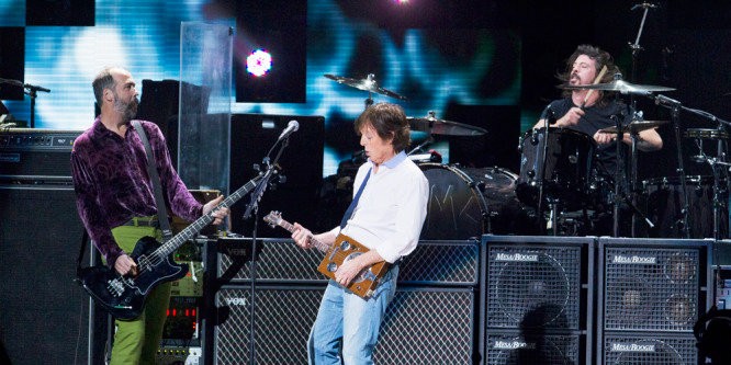 The former Beatles member performs a new song 'Cut Me Some Slack' with Nirvana's remaining members during the star-studded benefit concert.