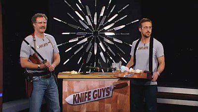 Ferrell and Gosling show up in the middle of Jimmy Kimmel's opening monolog to start their QVC show 'Knife Guys', not knowing that the talk show has been moved up to 11:35 P.M.
