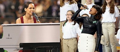 Keys sings the national anthem 'Star-Spanled Banner' before the game, while Hudson delivers a touching rendition of 'America the Beautiful' with Sandy Hook Elementary School Chorus.